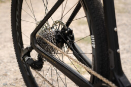 The rear triangle has also been redesigned to provide an outstanding riding experience on rough terrain. Rather than joining the seat tube, the seat stays continue to engage the top tube. In a strategic area of the frame where forces are concentrated, this design creates a more stable and strong node. The shortened chainstays provide better handling, while the asymmetrical design offers more traction. The frame is designed to accommodate generously sized tires, up to 700c x 44 or 650b x 48, and tackle the most extreme trails with maximum fun.