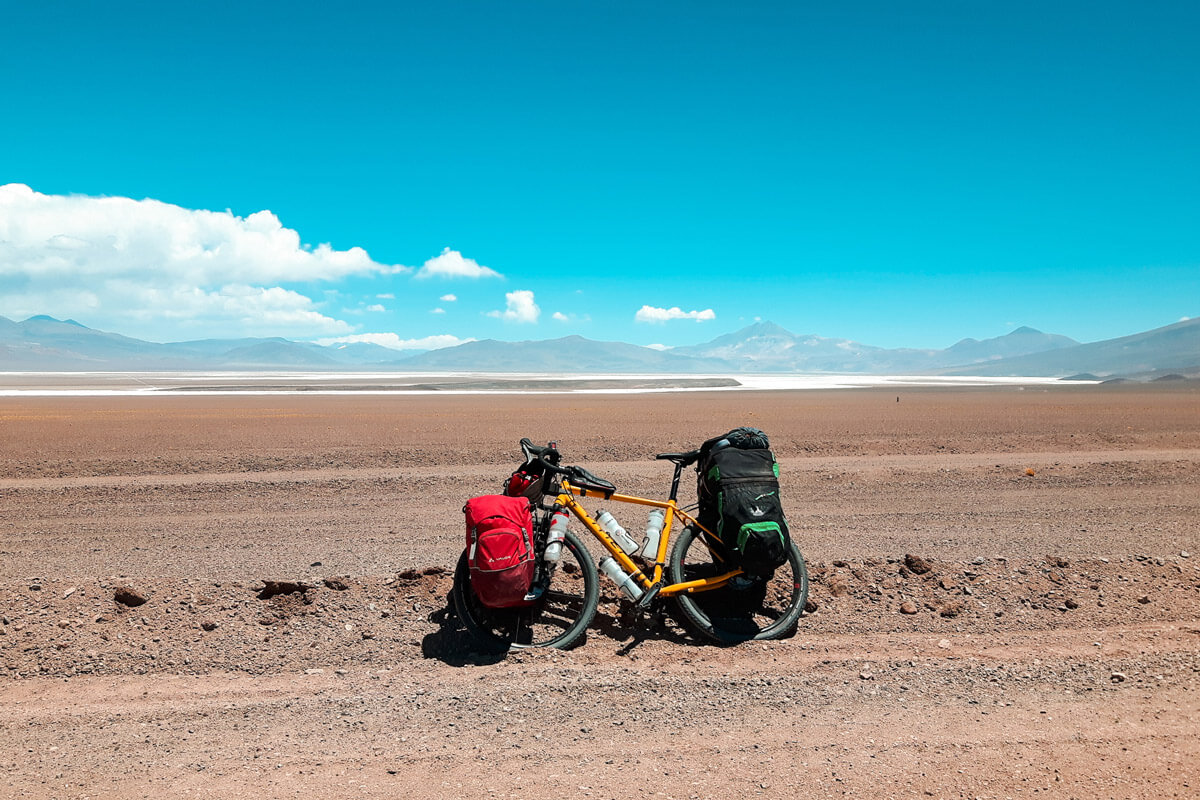 “A local company transported food and water to the two camps, Laguna Verde and Atacama. I took everything else with me on the bike: technical kit, walking boots, tent, sleeping bag, roll mat, down jacket for high altitudes, food and water. Basically, everything needed for a 14-day journey in the middle of nowhere. I wore basic trail running shoes for cycling with flat pedals, so that I didn’t have to take an extra pair of shoes specific to cycling. To carry everything, I attached a Thule universal rack to the front forks for carrying panniers. The bike is already set up for mounting rear racks, where I attached a Tubus rack. Both at the front and at the back I used Vaude bags and, finally, I attached a lighter bag to the handlebars. For water, in addition to two standard bottles, I added three bottle cages: one underneath the frame and two at the forks. This allowed me to carry five litres of water, although I still had to ask for more from the few cars that passed me on the way as, in the heat, I drank so much.”