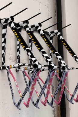 For the 2023 season, the SGT team was equipped with a fleet of RELLI bikes customized with a combination of Sartoria Ciclistica‘s iconic colors and the iso-hyphen of the Larian triangle, where it was possible to discover the coordinates of some of the most magical climbs. The top tube features stylized graphics of the mountains of Lake Como and the motto ‘WE RIDE FOR COFFEE’’ close to the headset.