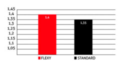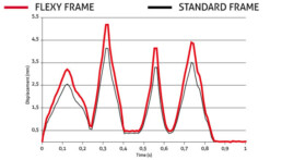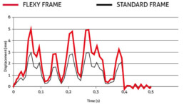 The graphics illustrate the greater vertical shift (that is, the increased capacity to absorb energy) of the Flexy frame under the solicitation of high frequency vibrations produced by irregular surfaces. In short: absolute comfort.